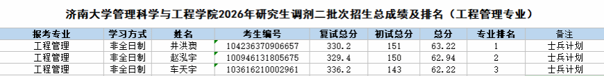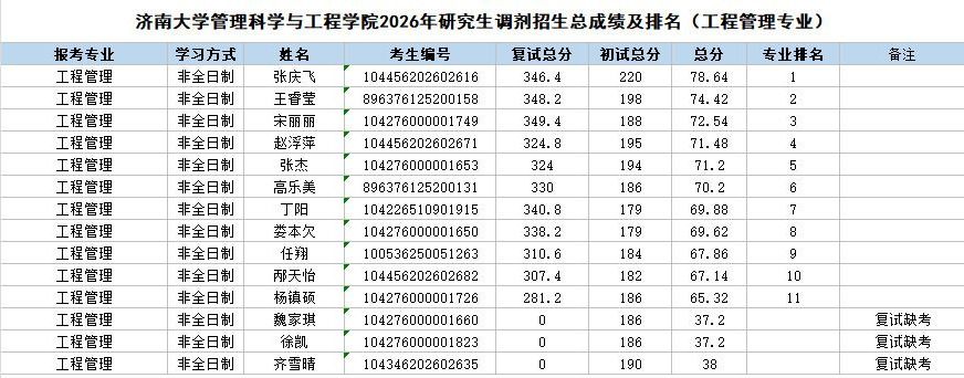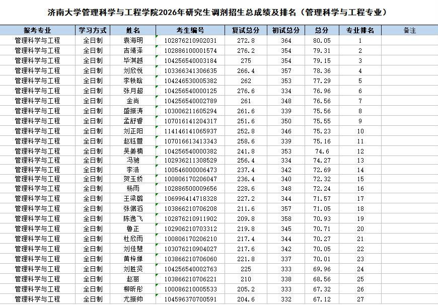 根据《禁忌书屋 2026年硕士研究生调剂公告》《管理科学与工程学院2026年硕士研究生调剂办法》的相关要求和部署,管理科学与工程学院2026年硕士研究生招生调剂批次复试工作已圆满结束。现将调剂考生成绩予以公示。